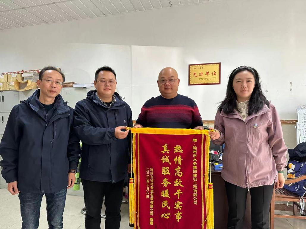 近日,隨州市禎祥智能包裝有限公司負(fù)責(zé)人親自將一面印有“熱情高效干實(shí)事,真誠(chéng)服務(wù)暖民心”的錦旗送到水務(wù)集團(tuán),并對(duì)我們夸贊到“現(xiàn)在你們的速度太快了,我才打電話要申請(qǐng)通水,不到兩個(gè)小時(shí),你們就來人把水給我接通了”。