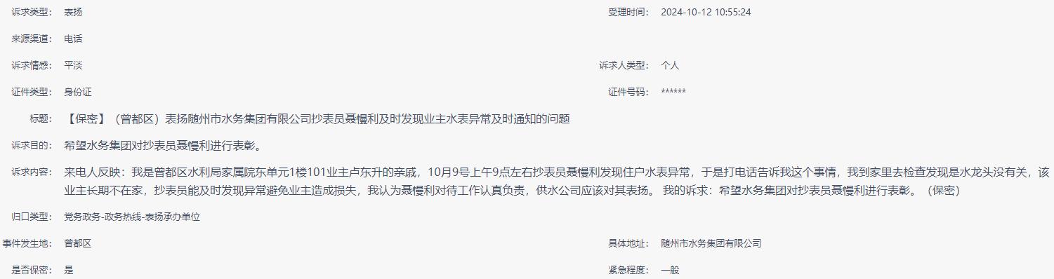 來電人反映:我是曾都區(qū)水利局家屬院東單元1樓101業(yè)主盧東升的親戚,10月9號(hào)上午9點(diǎn)左右抄表員聶慢利發(fā)現(xiàn)住戶水表異常,于是打電話告訴我這個(gè)事情,我到家里去檢查發(fā)現(xiàn)是水龍頭沒有關(guān),該業(yè)主長(zhǎng)期不在家,抄表員能及時(shí)發(fā)現(xiàn)異常避免業(yè)主造成損失,我認(rèn)為聶慢利對(duì)待工作認(rèn)真負(fù)責(zé),供水公司應(yīng)該對(duì)其表?yè)P(yáng)。 我的訴求:希望水務(wù)集團(tuán)對(duì)抄表員聶慢利進(jìn)行表彰。(保密) |