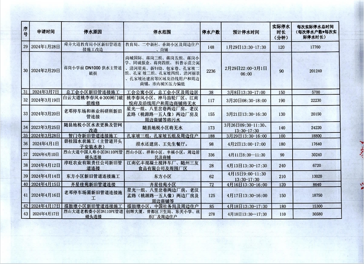 隨州市2023年9月至2024年8月計(jì)劃性停水資料