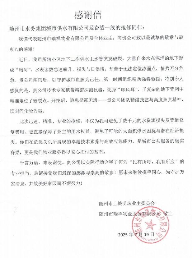 7月19日,上城明珠小區(qū)業(yè)委會(huì)與瑞祥物業(yè)的代表滿懷感激,將一面繡有“排憂解難、水域神探” 的錦旗和一封情真意切的感謝信送到城市供水公司,以此表達(dá)全體業(yè)主對(duì)城市供水公司的誠(chéng)摯謝意。“若不是有你們團(tuán)隊(duì)的精湛技藝與高度負(fù)責(zé)精神,我們的損失不堪設(shè)想!這面錦旗雖輕,卻裝著全體業(yè)主的滿心感激!” 代表們緊握工作人員的手,話語(yǔ)間滿是動(dòng)容。