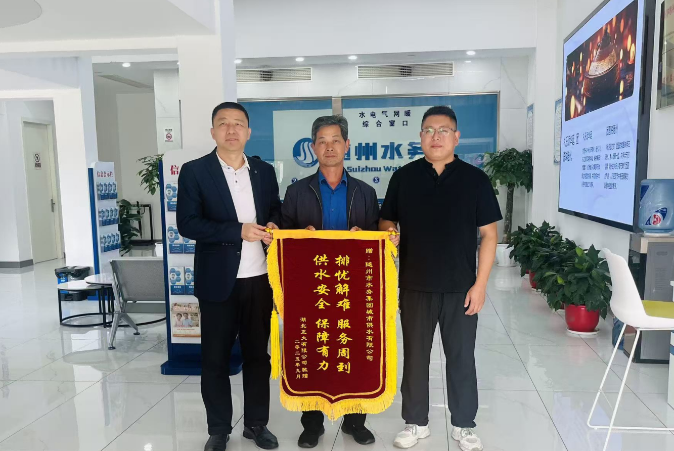 一面錦旗,一份認可。近日,湖北正大有限公司代表將一面印著“排憂解難 服務周到 供水安全 保障有力”的錦旗,鄭重送到隨州市水務集團城市供水公司工作人員手中。錦旗上的字跡雖簡,卻滿含企業(yè)對供水服務的由衷感謝,更成為對隨州水務人專業(yè)精神與責任擔當?shù)纳鷦影劇?/span>