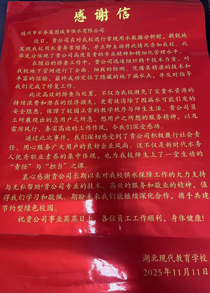 一面鐫刻著“明察秋毫堵漏點(diǎn),傾心服務(wù)暖師生”的鮮紅錦旗,隨同滿載深情的感謝信,被湖北現(xiàn)代教育學(xué)校負(fù)責(zé)人鄭重送到隨州市水務(wù)集團(tuán)城市供水公司。紙短情長(zhǎng),字里行間飽含對(duì)公司快速解決校園供水困境的誠(chéng)摯謝意。